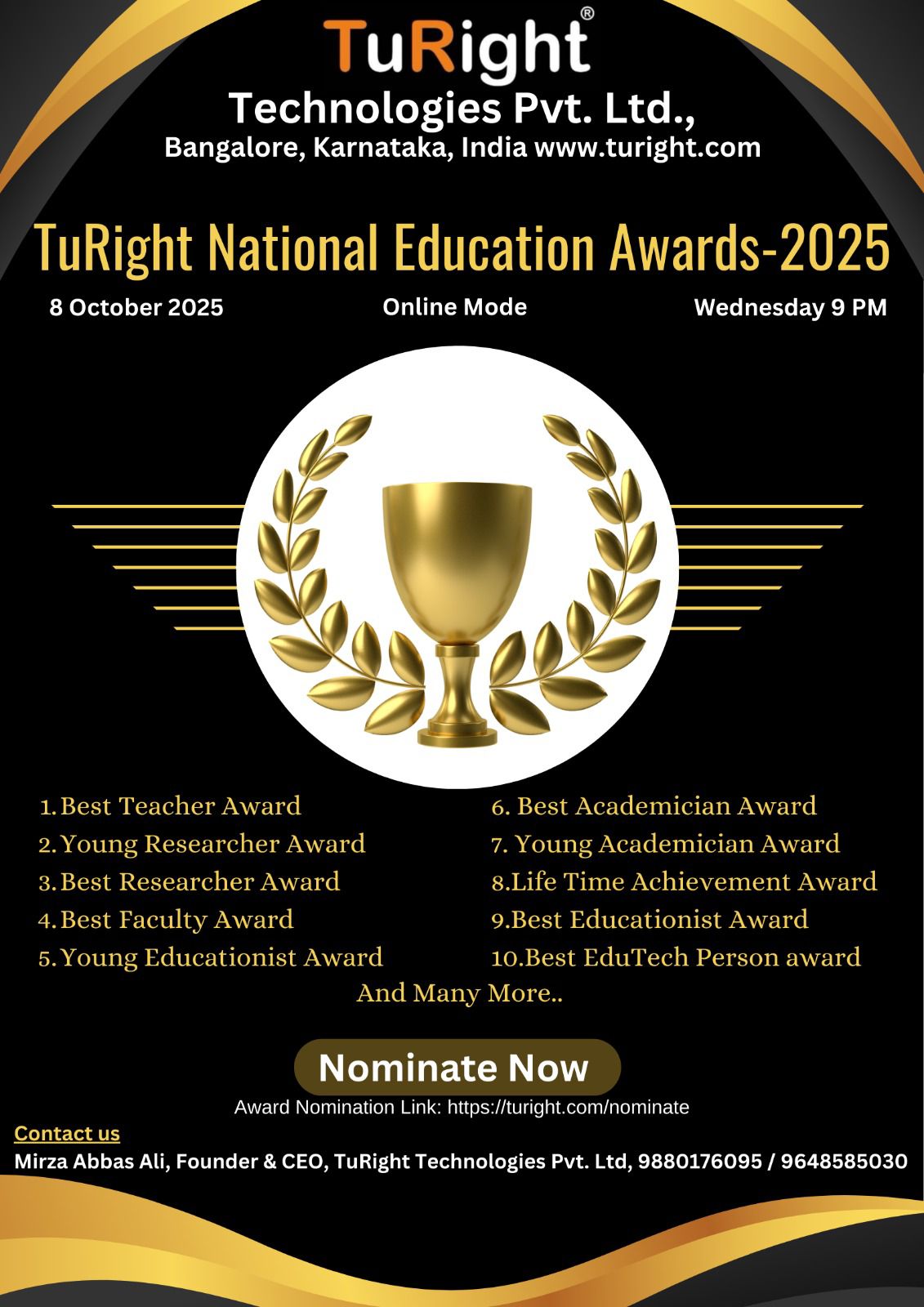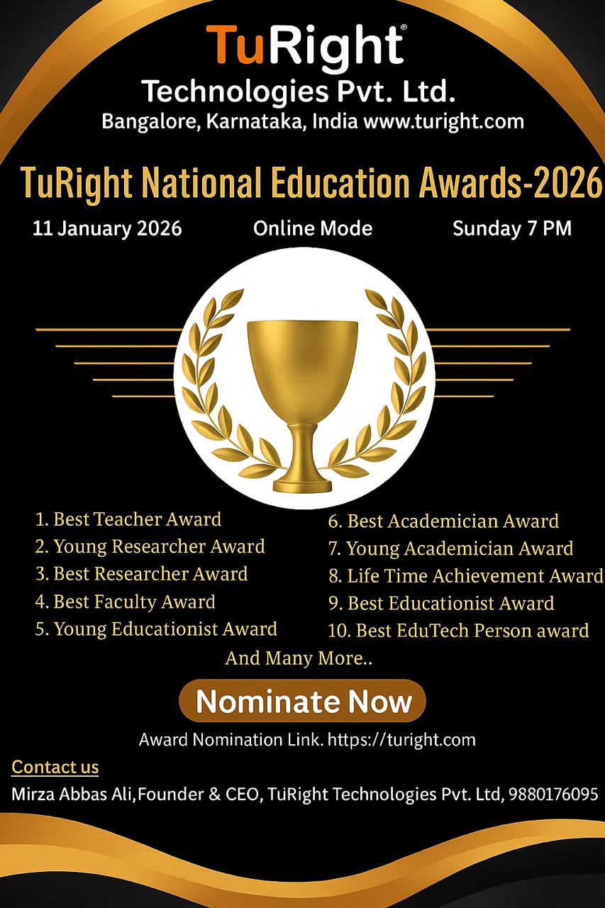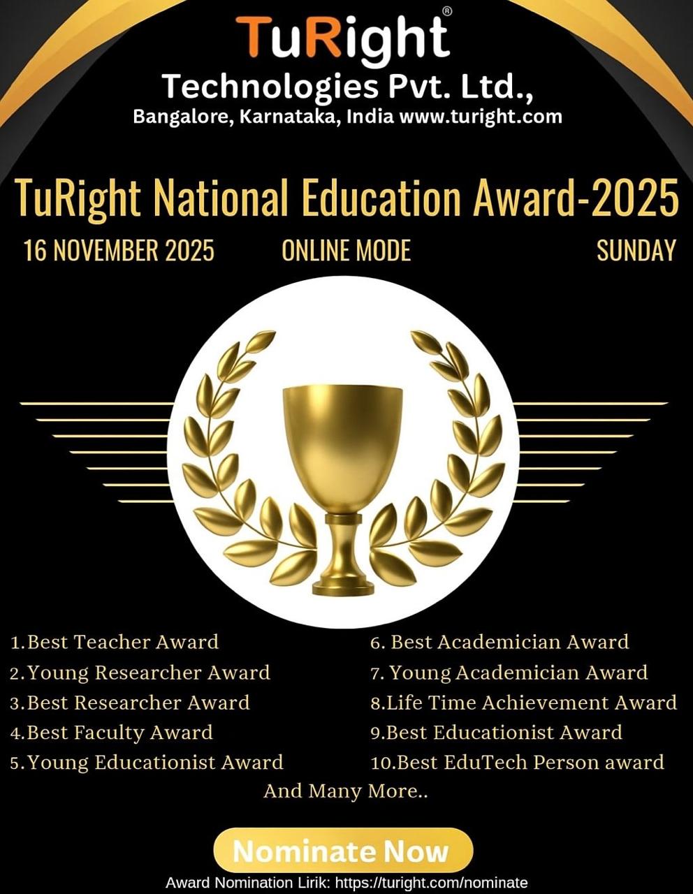 TuRight Technologies Pvt. Ltd., with its roots in Talk to Win Training, has been transforming lives through education, training, coaching & teaching for over a decade. Having empowered over 1 lakh students, researcher professionals, individuals, schools, colleges, Institutes, Universities corporate houses, and NGOs, we have made it our mission to unlock potential and create meaningful impact across India. We are working closely with national and international universities, organizations, colleges and institutes. We know what it feels like to be recognized, as TuRight has been honored with the Best Startup for Skill Education and Training Award and now we want to celebrate the educators who inspire every day. This Teachers' Day, we honor the true pillers of education and research - the teachers, lecturers, research scholars, academician and professors who dedicate themselves to shaping the future. Every educator deserves to be recognized, celebrated, and inspired on a national platform, and that's exactly what the TuRight National Education Awards are all about.